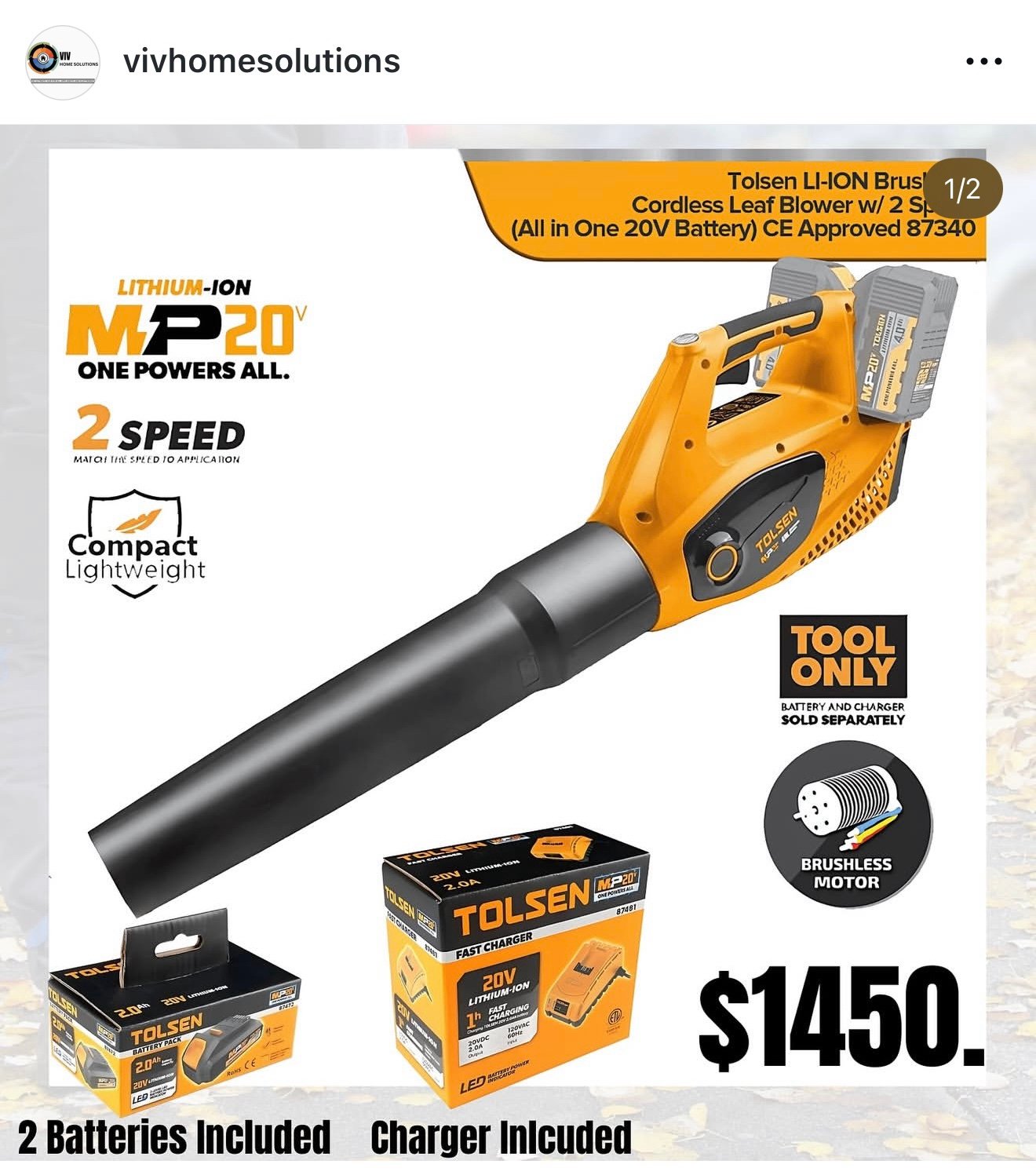 Tolsen LI-ION Brushless Cordless Leaf Blower w/ 2 Speed